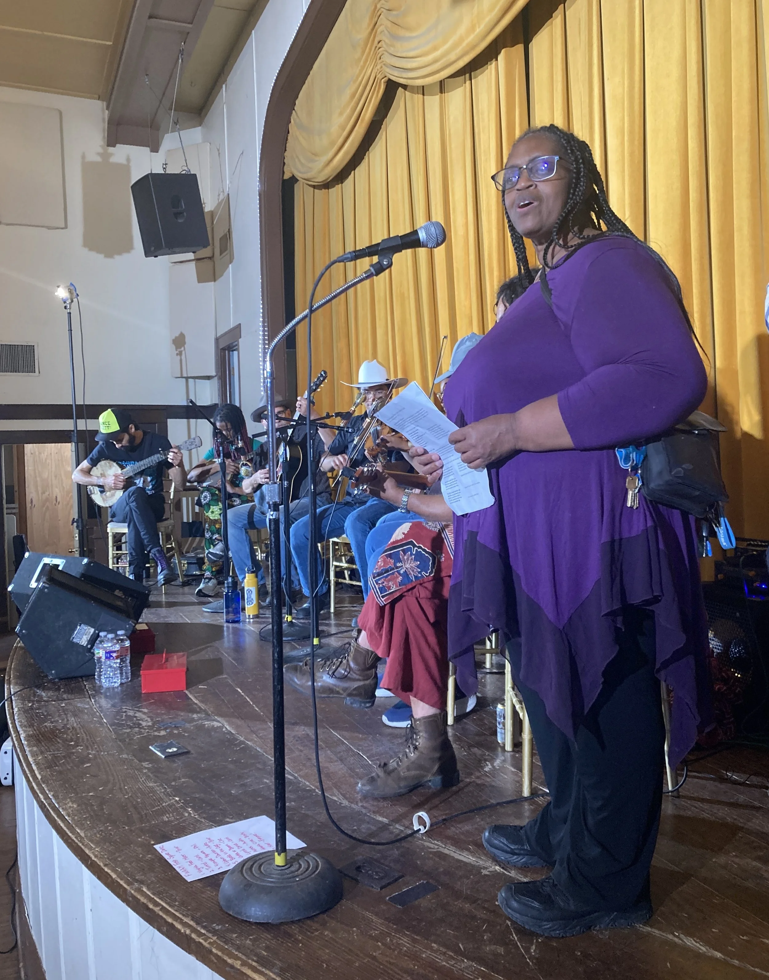 Over the last six months, I have been involved in the first African American Dance Caller Pathways Program, a project organized by musician Brandi Waller-Pace that involved three experienced callers (myself, Becky Hill, and Dr. Clo Johnson) working with a cohort of three apprentice callers (blues singer Briar, from Seattle, and Audra Scott and Carol July, both from Fort Worth). We started meeting monthly on Zoom last October, and in January, we got together in person for a workshop and a practice dance in Fort Worth. This weekend, we returned to call a community dance together at the 6th annual Fort Worth African American Roots Music Festival. It was a joyous event and the launch of these three African American dance callers! For more, read: Shining a Light with the African American Dance Caller Pathways in Fort Worth, Texas